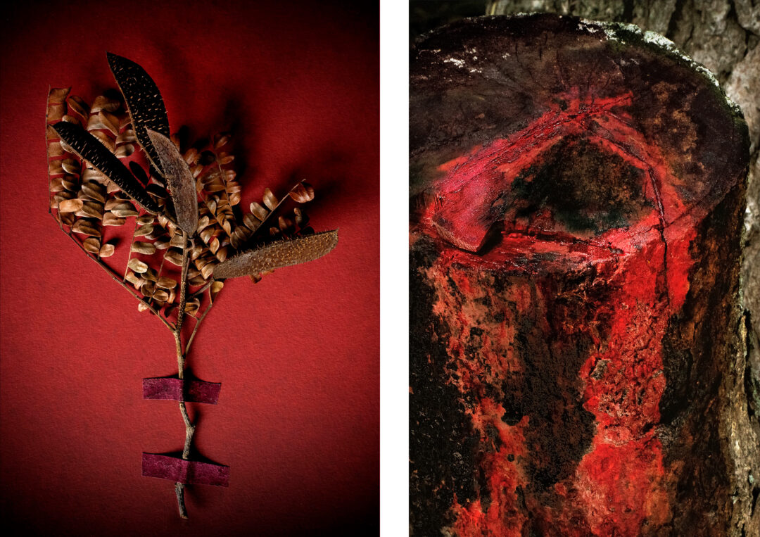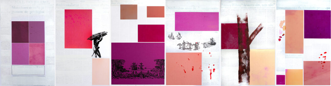Cortar uma árvore e com ela fincar uma cruz na terra foi o primeiro ato de apropriação dos portugueses que chegaram em território indígena. À catequização imposta por eles se seguem diversas imagens da exploração do pau-brasil e dos indígenas que realizavam seu corte e seu transporte. Do valioso e raro corante, extraíam-se diferentes matizes de vermelho, púrpura, escarlate e carmim, cores que eram símbolo do clero e da nobreza europeia. Mas o rubro, da madeira brasa e do sangue indígena, tornou-se também símbolo da violência que rotulou a Costa do Brasil à semelhança da Costa do Marfim, Costa dos Escravos, Costa da Mina e Costa do Ouro em África, como ressaltou o historiador Eduardo Bueno em seu livro de 2002 Pau-brasil. Ou ainda, como nos sugeriu a antropóloga Karen Shiratori: a hecatombe socioambiental que atingiu a Mata Atlântica, o pau-brasil e os povos originários em 1500 bem poderia ser nomeada de Rubroceno.